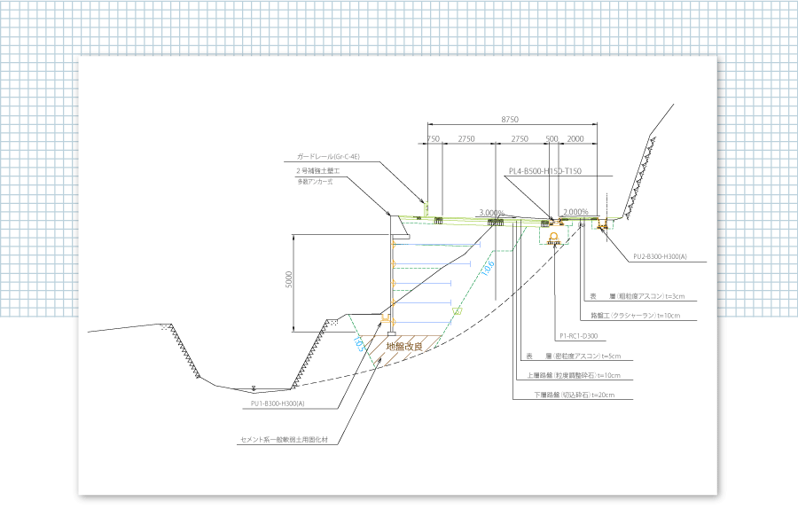 道路は人や車両が通行する通路であり、私達の生活や経済活動に欠かせないものです。道路の種類には、高速自動車道・一般国道・都道府県道・市町村道があり、その他農道・林道などがあります。弊社は、路線計画された道路について、現地調査を行うとともに所定の基準に基づいて、平面図・縦断図・横断図等の設計図を作成します。また工事金額が算定できる工事数量も算出しております。