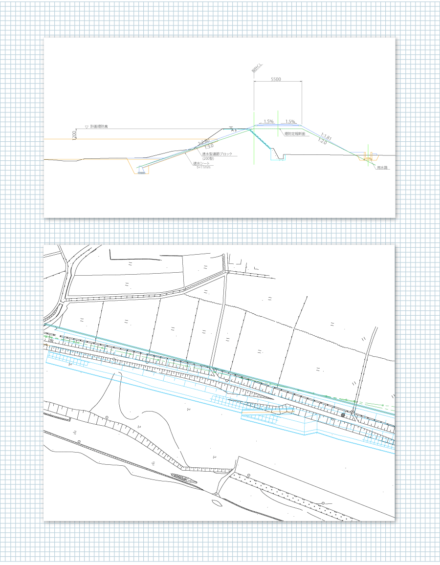 河川の機能は、上流域山間部の雨水を河道に集めて、海又は湖沼に流下させる事です。水が流れる流路を河道といい、自然河道及び人口河道があります。河道においては、洪水により家屋等の資産を防護するため川幅を広げたり堤防を計画したり、また住民の憩いの場としての施設を計画したりしています。弊社は、河川整備計画で提案された箇所について現地調査を行うとともに所定の基準に基づいて、平面図・縦断図・横断図等の設計図を作成します。また工事金額が算定できる工事数量も算出しております。