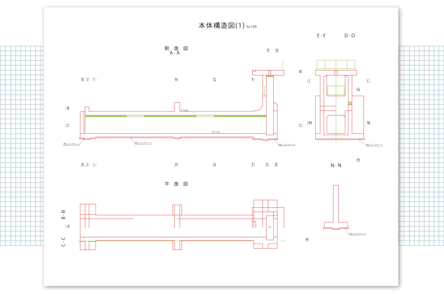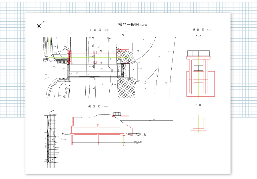 土木構造物は、道路は橋・トンネル・擁壁・法面保護・横断暗渠等、また河川はダム・排水機場・水門・樋門・堰・床止め等があります。弊社は,道路計画、河川計画で必要になった土木構造物の設計を行っています。作業能力範囲は、道路は擁壁、法面保護、横断暗渠等、また河川は樋門、床止め等です。設計では現地調査を行うとともに所定の基準に基づいて、構造図・配筋図等の設計図を作成します。また工事金額が算定できる工事数量も算出しております。